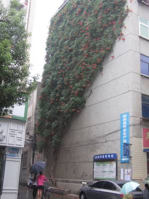 七夕节期间,湖北省郧西县安全生产监督管理局办公楼门前道子口,一丛四棵直径5—12厘米,高18米,占墙面积150平方米的爬山虎编织的绿壁吸引游客驻足观赏.该爬山虎栽植单位郧西县交通局局长程骏介绍说:这丛爬山虎生长了20多年,由萌生的4根主茎组成,经多年生长呈长方型,成为全省首屈一指的大型爬山虎植物。