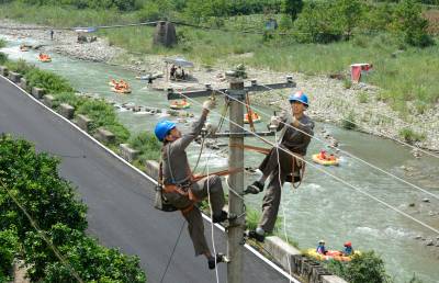 炎炎夏日,被誉为“中华第一漂”的九畹溪漂流景区自5月29日开漂以来,日接待游客近万人次。为确保开漂期间安全可靠供电,国网秭归县供电公司九畹溪供电所主动上门,对景区内的用电设备、供电线路进行巡查及维护,为景区提供电力保障。 视觉网:雷勇 陶金(摄)