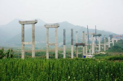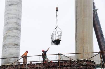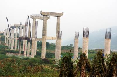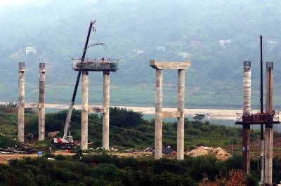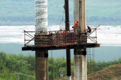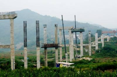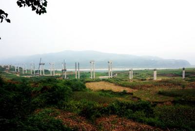 8月22日,建挢工人正在郧县辽瓦复建新集镇旁加快建设辽瓦复建大桥。辽瓦大桥长486米,宽12米,于2013年12月12日开工建设,2014年底建成该桥是南水北调中线工程"柳五路"的复建工程,新"柳五路"全长40.946公里,二级公路标准,设计时速60公路,总投资5.6亿元,2015年底全部建成后将惠及2个乡镇,30个村,4.7万人囗。 视界网周家山 赵弘然摄