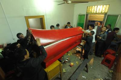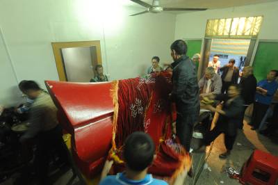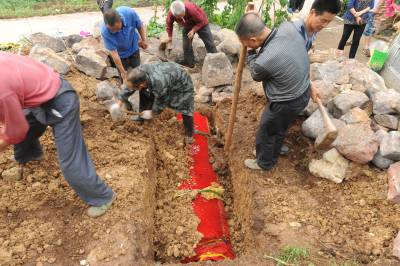为了考察屈乡红棺葬的现状,2014年6月16日,笔者赴秭归县两河口镇王家垭村一组,目睹了村民吴前哨的安葬过程。吴前哨,男,因病而亡,享年48岁。晚上8点钟赶到现场时,死者已经入棺,棺材安放于灵堂,棺材外面罩着红色金丝绒的棺罩。棺罩制作精美,并绣有龙凤呈祥的图案。夜晚长达数小时的转丧鼓,歌僮、礼生、乐手,围绕棺材边走边唱追忆亡者、超度亡灵的丧鼓歌,孝子披麻戴孝,手持“杵丧棍”,一起随着转丧。17日凌晨5点钟封殓之前,将金丝绒棺罩揭去,露出红棺材,挪开棺盖,对棺内作最后整理,孝子最后瞻仰遗容,之后在棺口边缘涂上石灰浆,合上棺盖,又罩上红色金丝绒棺罩。凌晨6点钟出殡,6点20分下葬,6点30分开始掩土。但就在掩土之前,有人欲将红棺大头上的金丝绒棺罩拉起来,想让棺材的大头露出,但因当时棺罩无法拉起来,最后就把棺罩撕开一个口子,露出了棺材的大头。我问为什么要拉起或撕开棺罩露出棺材的大头,回答是:为了有出头、出气的地方(亡人的头在棺材的大头)。