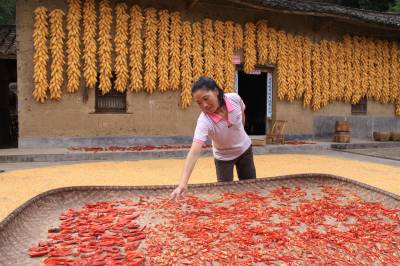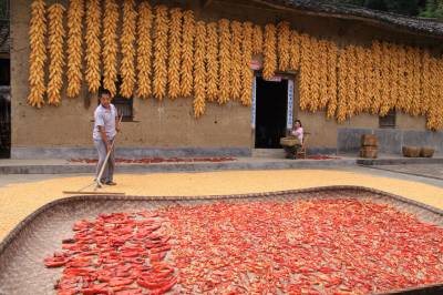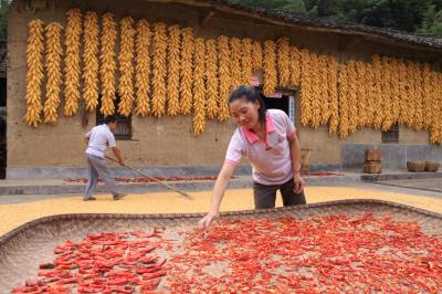 山乡处处晒丰收 (图文) 竹山县宝丰镇中心学校 朱本双 电话:13177481456 邮编:442213 电子信箱:zsbfzbs@126.com 身份证号码:422624196910182052 8月24日,在竹山县宝丰镇漆树扒村三组一农户门前看到,火红的辣椒、金黄的玉米构成一幅漂亮的丰收图。时下正是丰收季节,乡村各家各户纷纷开始晾晒刚刚收获的玉米、水稻等农作物,到处洋溢着丰收的景象。