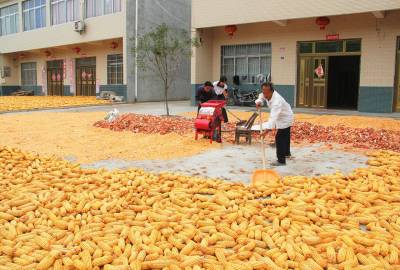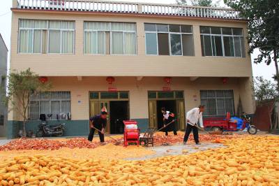 玉米丰收农家忙 8月26日,谷城县冷集镇双阳桥村村民冷元超正为丰收的玉米脱粒、翻晒。今年53岁的冷元超今年流转土地32亩,采用科学方法种植优质玉米,在干旱年景下,每亩仍然获得650公斤的好收成。 视界网马明刚摄
