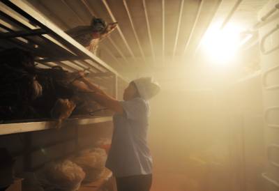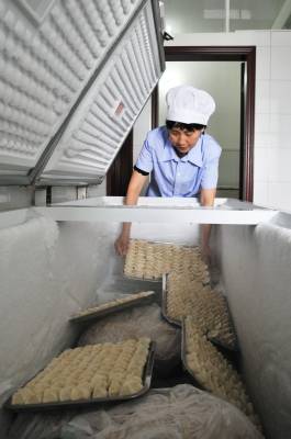 25日,李敏芳从冻库里取出腊肉,(图7828)洗净、剁碎,加上作料,(图7835或7845)搅拌均匀后手工包水饺,(图7747)大量的水饺冷冻后销往宾馆、超市、夜市。(图7820)