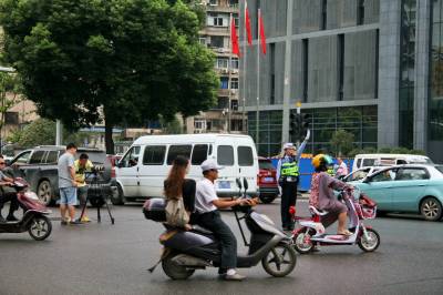 8月29日7时30分,汉口新华路与雪松路交会口的车流中,两名拍客将三角架支在马路中间,让女交警变化不同姿式,先用广角后换长焦,从远近仰俯多种角度进行拍摄。摆拍长达半小时,引起市民围观。市民对此议论纷纷:从未见过这个路口有女交警执勤,分明是摆拍做秀。既添堵,又危险。 易弦 摄 武汉市江汉区园林局 张垠 430022