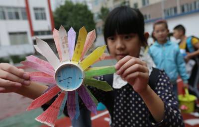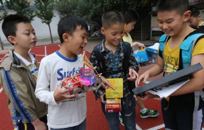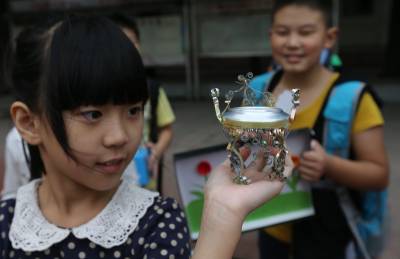 8月31日,米公小学爱迪生科学社的学生们在观赏暑期个性作业——利用废旧物资制作的各类手工制品。当日是襄阳市的中小学生新学期报名时间,襄阳市各所学校在今年暑期布置有个性作业。学生们在报名时陆续上交他们暑假做的“作业”,仅樊城区,米公小学的10个社团均根据各自特色布置了多类“个性特色”。