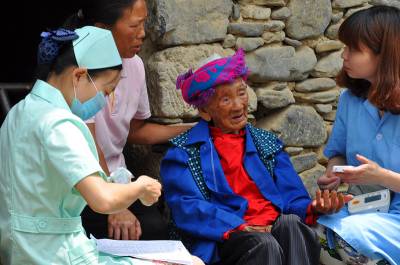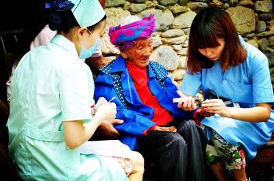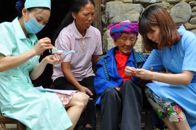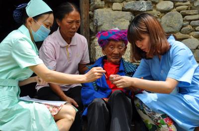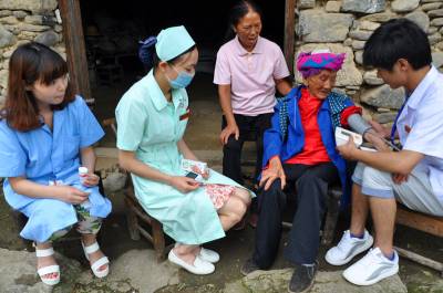 鹤峰县五里乡现有80岁以上的高龄老人484人,其中100岁以上2人。今年来,五里乡卫生院把高龄老人的健康长寿作为今年医院重中之重工作,挤出资金 4.5 万元,先后抽出医生18人,历时20多天跑遍全乡高龄老人之家,为全乡80岁以上人高龄老人214人进行身高、体重、视力、听力、血压和血常规、肝肾功能、血糖、血脂、心电图、尿常规等健康检查。图为五里乡卫生院的医务人员驱车30多公里到中坪村5组103岁的舒润生家,给老人进行义检,送去药品。 (本报视界网何吉安、丁涛摄)