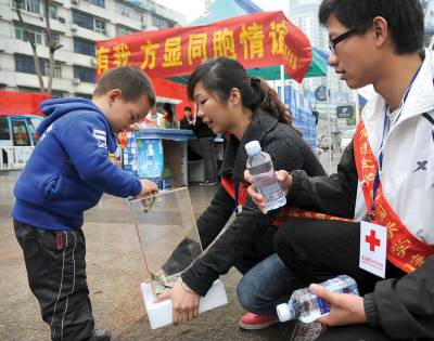 我为灾区献份爱25日,黄石市一些商家纷纷为玉树地震灾区开展”义卖”募捐活动,把”义卖”所得全部捐给红十字会和慈善总会。图为黄石市理工学院的大学生在街头为天蕴泉苏打水”义卖”募捐。黄石市黄石日报摄影部邱孝威摄电话:13807232603邮编:435002
