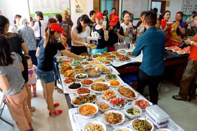 每位居民都带来自己的拿手好菜,鱼香肉丝、糖醋排骨、蒸腌肉、酸辣土豆丝……丰富的菜肴,摆了30桌,吃着流水席,近500人参加“百家宴”。