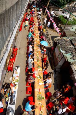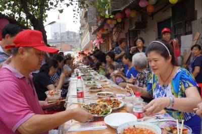 4日上午,整条河水巷人声鼎沸,民主路社区门口整齐摆放着30张长桌,510余名居民津津有味地品尝着自制的“百家”美食,聊着60的邻里情。据了解,民主路社区位于宜昌老城中心,即将迎来棚户区的拆迁改造。许多久居在民主路的居民,既有对搬迁的美好憧憬,也有对故土家园的无限眷恋。