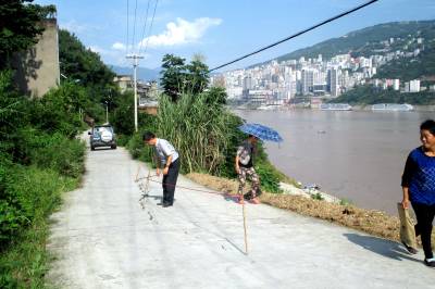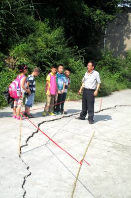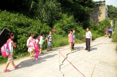 9月4日下午,巴东县官渡口小学一教师在危险路段拉“警戒线”。 新学期开学以来,巴东连续几天的强降雨,该县官渡口镇东坡社区的移民路(老官渡口三叉至原官渡口镇中)地段的公路出现长十余米凹陷,裂缝宽约2寸的险情,给就读于官渡口小学的数十名学生带来极大的安全隐患。学校迅速组织老师上路牵上警戒线,并告诫学生路过此地要千万小心。目前,该险情已得到当地政府的高度重视,正在积极解决。(视界网向国大摄)