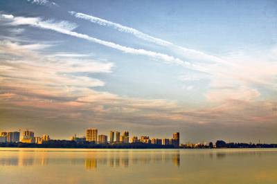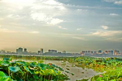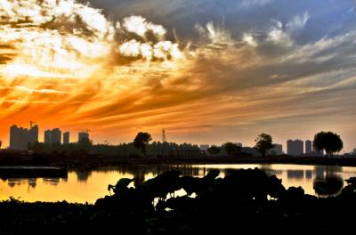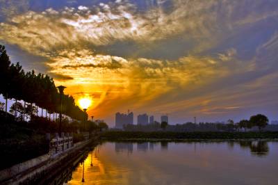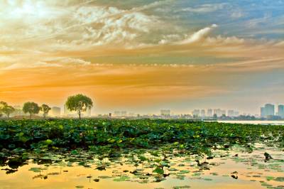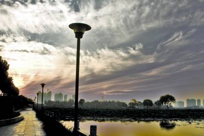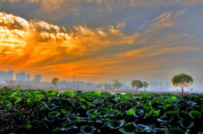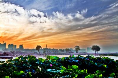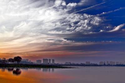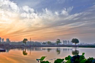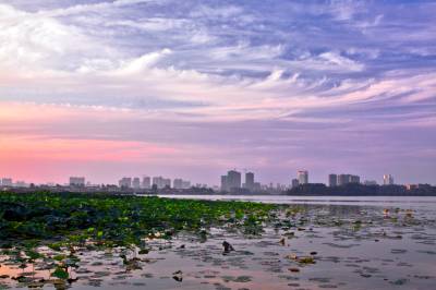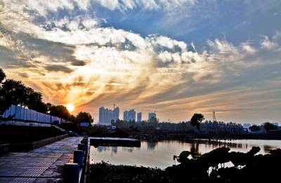 中秋时节,黄州遗爱湖上空常常出现变幻多彩的晚霞,给城市增添不少光彩。