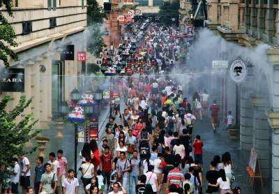 中秋长假,汉街人头攒动,街两旁的自动喷雾齐开,白雾袅袅,营造出一派浪漫的节日气氛。 张垠 摄 武汉市江汉区园林局 430022 13971281317