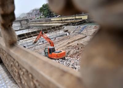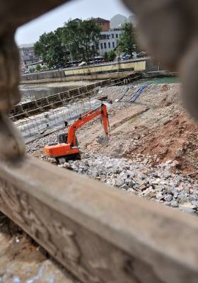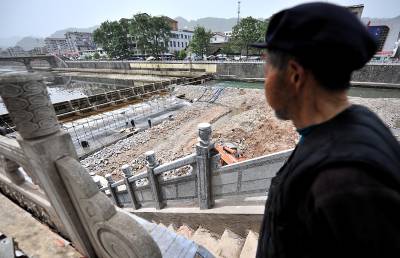 26日,一名老人在河堤上观看”贡水走廊”水力自动翻板坝施工。宣恩县利用贡水河穿城而过的优势,致力打造山水相融的宜居山区小城,并将土家族、苗族、侗族等民族风情元素融入建设过程中,使之形成”民族风情走廊”,为融入鄂西生态文化旅游圈作准备。(视界网签约摄影师:宋文摄)