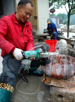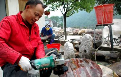 4月22日,长阳县何家坪村农民在专心打磨奇石。该村常年从事奇石采集、收藏的农民达千余人,年销售收入1200万元以上,全村人平奇石收入5000元以上,成为荆楚奇石第一村。(通讯员杜强、陈万华)