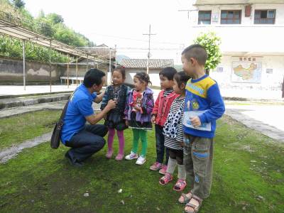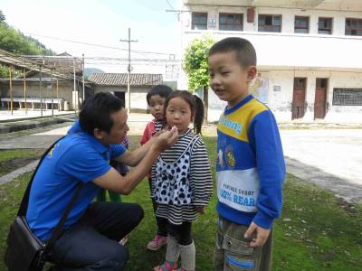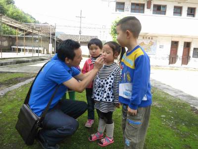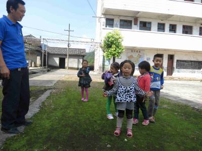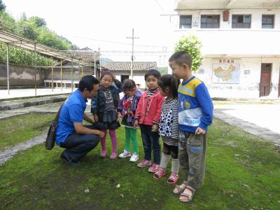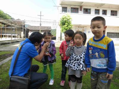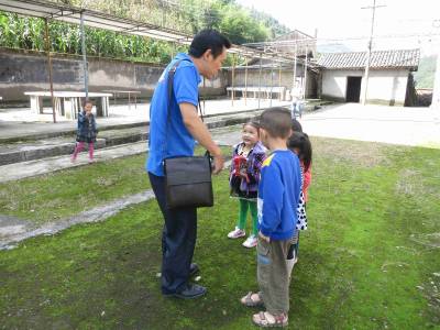 在秭归县梅家河乡海拔800米的高山之巅,五个孩子与两个老师开学了,该乡中心小学的校长宋君在教师节来临的前夕来到肖家坪小学来看望坚守岗位,守候五个孩子的两位老师。图为校长宋君正在给学生擦拭嘴角。