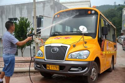 9月9日,巴东县官渡口镇四季坪幼儿园司机正在冲洗校车。 该园暑期投资22万多元,从河南郑州采购一辆豪华校车,秋季开学投入使用。该镇农村6所民办幼儿园,聘请专业教师,购买校车,让农村幼儿就近入学专车接送,享受快乐、幸福童年。巴东县官渡口镇政府 向传辉 摄 电话 18963928551