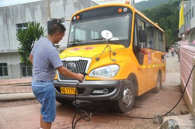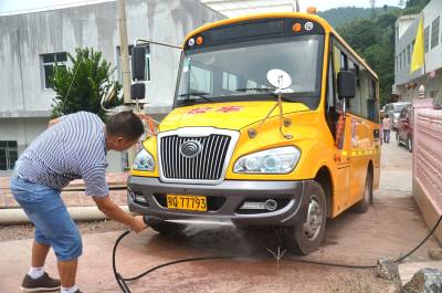 9月9日,巴东县官渡口镇四季坪幼儿园司机正在冲洗校车。 该园暑期投资22万多元,从河南郑州采购一辆豪华校车,秋季开学投入使用。该镇农村6所民办幼儿园,聘请专业教师,购买校车,让农村幼儿就近入学专车接送,享受快乐、幸福童年。巴东县官渡口镇政府 向传辉 电话 18963928551