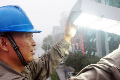 9月12日,2014年环中国国际公路自行车赛老河口赛区在襄阳老河口市举办,来自全球22个国家和地区的运动员、教练员、媒体人员从9月10日开始陆续齐聚于此。老河口市供电公司高度重视这一国际赛事保电工作,对赛区路段的路灯进行检修维护,确保赛道的亮化。图为9月11日,电力员工在冒雨检修路灯。