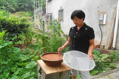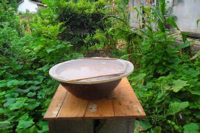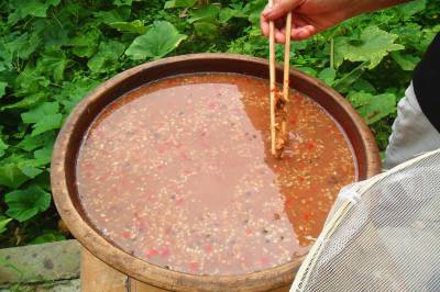 自古以来,宜昌农家都做土酱。土酱是民众对自制自用的豌豆酱、黄豆酱、小麦酱的统称。做这种酱一般在白露前后,完成去壳蒸煮、发酵、晒干揑散、淘洗、点卤水伴料等工序后就要晒酱。晒酱是将装有土酱的陶制瓦盆(不能用鋁盆、不绣钢盆,易腐蚀)置于室外日晒夜露,用一篾圈粘满蜘蛛网后盖在盆上,防蚊蝇树叶等杂质进入;每天搅动一次,使其晒露均匀;变天时及时将铁耳锅反扣在瓦盆上,防止雨水进入;盆里的浆水蒸发变干时要补充凉开水;把酱晒好一般需要50天左右。这种农家土酱为粘糊状,呈土黄色或棕红色或暗紫色,气味淸香醇厚,味道鲜甜爽口,既可当菜吃,又可当佐料使用。21世纪初以来,年轻女性不愿意学这门技艺,逐渐从市场上购买发酵好的干豌豆辦做酱,还省去了日晒夜露的工序。2014年,宜昌市夷陵区分乡镇仅2成主妇传承晒酱的习俗。(本报视界网 袁国悦摄)