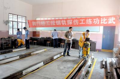 “擂台”上的较量 荆门桥工段2014年练功比武剪影 为不断提高职工的业务素质和技术水平,激发职工爱岗敬业、刻苦钻研业务的热情。近日,荆门桥工段在管内多个地方摆下“擂台”,采取理论考试与现场实操相结合的方式,精心组织由15个车间277名选手参加,以班组KYT演练、水泥岔枕拔锚、钢轨焊接等为主要内容的练功比武活动。