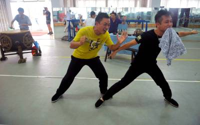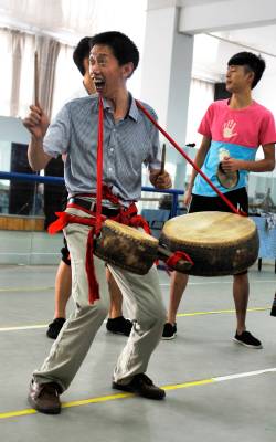 9月12日,湖北省非遗传承人谭学聪和青年演员一起训练非遗项目“薅草锣鼓”。