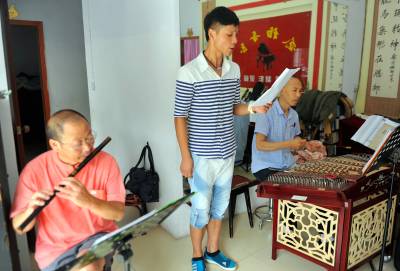 9月12日,湖北省恩施市非物质文化遗产保护传承展演中心青年演员在州级传承人周金福的指导下,练习国家非遗传承项目“恩施扬琴”的唱腔。