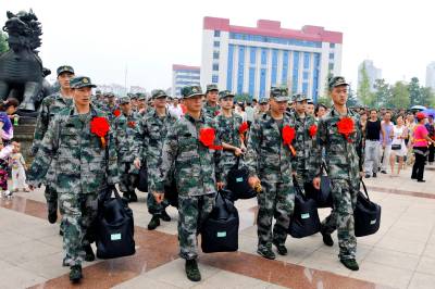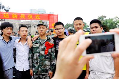 9月10日,鄂州市举行2014年欢送新兵仪式,近十年来第一批去往甘肃、宁夏的新兵踏上军旅征程。图一,新兵在与家人告别。图二,与好朋友们合影留念。图三,提起行囊,大步出发。 郑博 摄