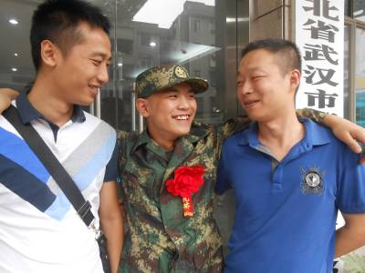 9月13日下午,武汉市江汉区人民政府区人武部,在武昌火车站广场举行仪式,欢送走了第三批2014年的新兵有40名,奔赴湖南某地部队,其中有大学生26名,还有孤儿兰尧(中)他也穿上新军装入伍了。96年1月出生的他,从2005年起,在武汉儿童福利院代养,2012年因年龄较大的原因,由该区民政局代养,局办公室赵俊具体负全责(右)后,委托了区永康老年公寓院长肖月飞(左),全面照顾他的衣食住行。为回报党和国家社会的培养,他积极报名参军,圆了自己的强军梦。