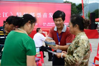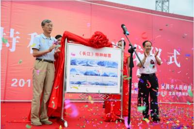 2014年9月13日上午10点38分,《长江》特种邮票首发式在宜昌三峡大坝截流园举行。邮票的设计者郝旭东、杨文清出席首发式,并为集邮爱好者签售。中国邮政发行的《长江》特种邮票1套9枚,内容分别为大江东去、山水重庆、三峡奇观、楚湘临江、庐山水韵、黄山独秀、金陵春晓、江畔水乡、东流入海。其中第三枚《三峡奇观》描绘的就是宜昌三峡的奇美景观。全套邮票面值为13.20元。