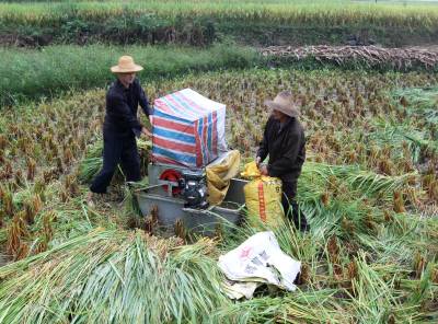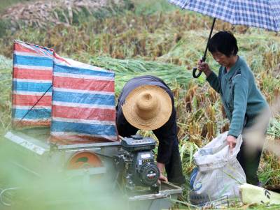 冒雨“抢”收 9月17日,竹溪县中峰镇同庆沟村村民冒雨抢收稻谷。9月后,竹溪县8.5万亩水稻陆续成熟,但8日以来该县遭遇10天的连绵秋雨,近几天,该县农民冒雨抢收成熟水稻,避免减产。