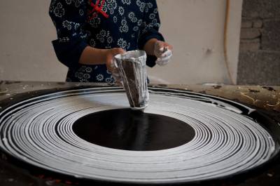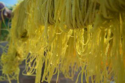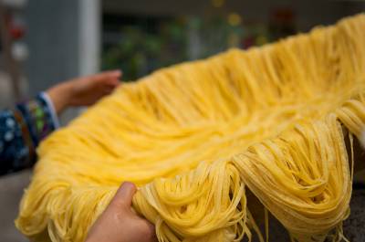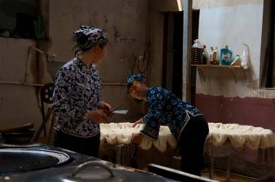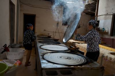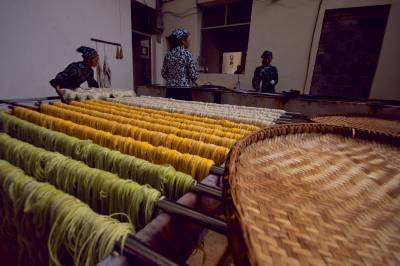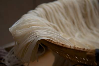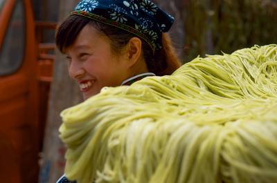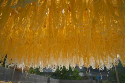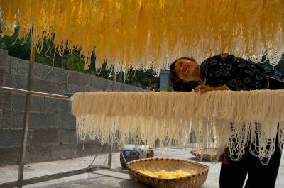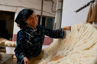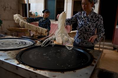 恩施豆皮是恩施地区特有的一种传统小吃,早中晚宵夜餐桌上都有豆皮的身影,豆皮制作的主要原料是米和土豆淀粉,绿豆皮(菜豆皮)和包谷豆皮等其他品种则需要添加相应的原料,传统做法是先将大米浸泡,按口味喜好可加入绿豆、蔬菜、玉米等,研磨成糊,按一定的比例添加土豆淀粉,搅拌均匀,将米浆在热锅里摊成皮,切成丝,或者在热锅里用特制漏斗盛装旋转烙成粉丝状,然后将成品晾干,豆皮就算制作成功了。制成的豆皮可煮可炒,通常佐以鸡、鸭、鱼、肉、菜等,口感绵软滑爽,回味无穷。本组图片2014年8月3日拍摄于恩施龙洞一家转锅豆皮作坊,作坊老板娘是一位勤劳朴实的80后,从她灿烂的笑容里我们能看到她对自己的豆皮事业充满了信心!