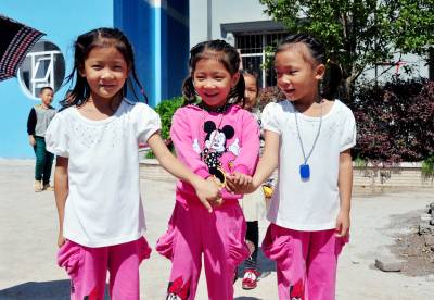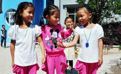 19日,静宸 静雯 静琪三胞胎姐妹下课后手拉手在操场上相互逗乐。