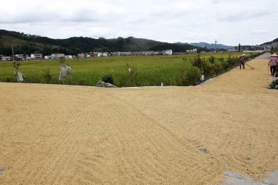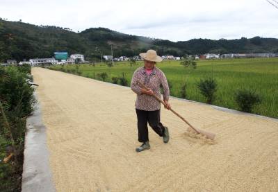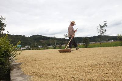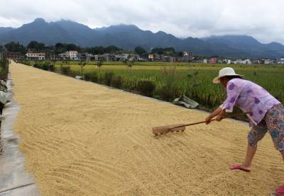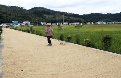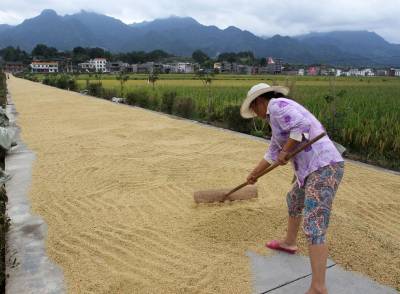 9月19日,竹溪县中峰镇一农民翻晒稻谷。当日,竹溪迎来了10几日阴雨天后的首个晴天,该县农民抢抓晴好天气进行秋收、秋晒,争取秋收颗粒归仓。