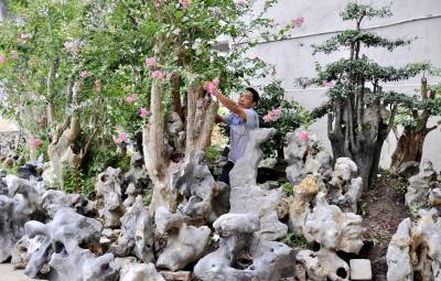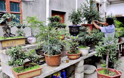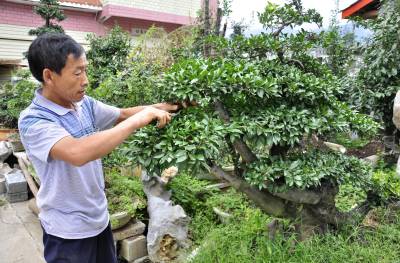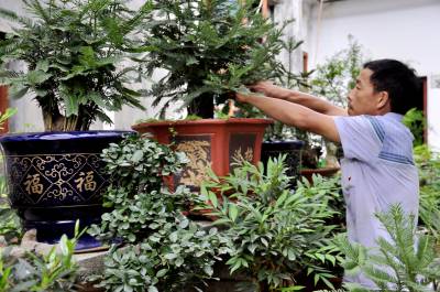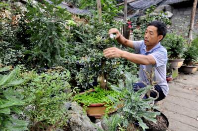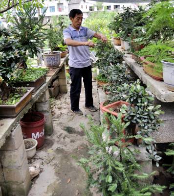 巴东:清江库区移民玩园艺走上致富路 9月16日,巴东县水布垭镇三友坪村二组移民户柳昌义正在盆景园对花木盆景进行管理。