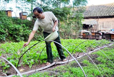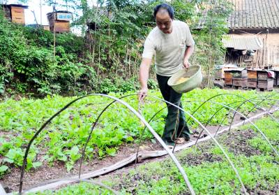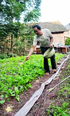 20日,向高贤正在菜田边投放拌有农药“杀虫双”的玉米面灭菜虫。 46岁的向高贤家住巴东县官渡口镇西瀼口社区八组,是一名地地道道的庄稼汉子,高中毕业后一直在家务农。他利用离县城近优势,大力发展蔬菜种植、蜜蜂和生猪养殖等产业,年纯收入逾6万元,成了当地发家致富“领头羊”。(本报视界网穆世祝摄)15335850858