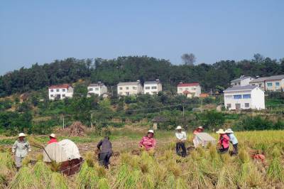 9月21日,分乡场村留守妇女互助组正在收割水稻。 宜昌市夷陵区分乡镇常年有3000多名已婚妇女的丈夫外出务工,留下妇女一人在家耕种责任田。9月初,镇计生协发出倡议,由各村计生协牵头,会同村妇代会及村民小组,将留守妇女组织起来,成立了400多个留守妇女互助组,互帮互助割水稻、掰包谷,不仅解除了留守妇女的心头之忧,还促进了邻里间的和谐。(本报视界网 袁国悦摄)