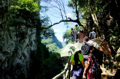 景区内的三段幽奇峡谷,自然经典,天然奇观约200多个景点。绝壁古洞,漫道雄关,蟒藤古树,鸟语花香,与世隔绝,一尘不染,游览景区有穿越时空之感。