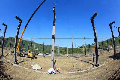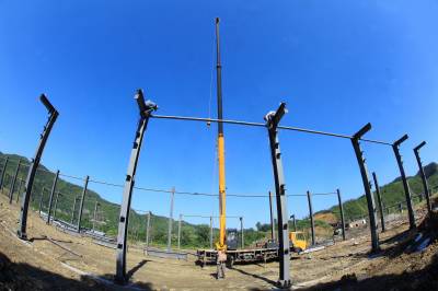 竹山县最大食用菌加工项目即将投产 9月22日,工人在竹山县潘口乡龙王沟村建设食用菌厂房。今年通过招商引资,湖北裕国菇业集团投资的湖北裕源食品有限公司在该县潘口乡龙王沟村建设养菌房3000平米,大棚面积5000平米,占地40亩。主要经营干制香菇、黑木耳、香菇罐头、各类果蔬罐头等。投入生产后,全县香菇产业通过“公司+基地+合作社+农户”的基地示范引导模式向农户辐射发展。(视界网 章磊 摄)