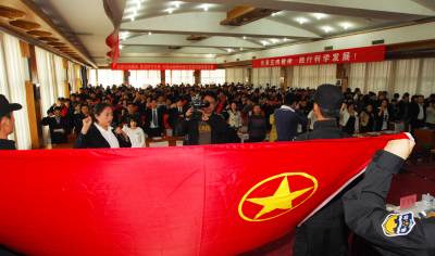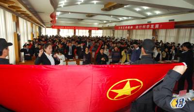 4月28日,共青团襄樊市委组织各界青年团员集会,纪念”五四”运动91周年,表彰全市共青团系统的先进集体和各类优秀青年典型,展示当代襄樊青年风采。这是全体青年重温入团誓词。