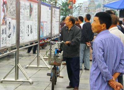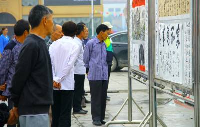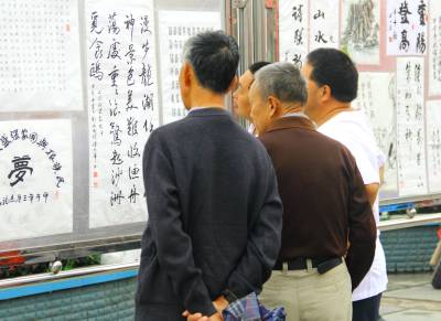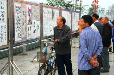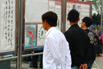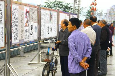 9月26日,市民正在宣恩县河滨广场上观看书画展。当天,宣恩县举办庆祝建国65周年书画展览,共征集书画、书法作品100多幅,抒发了广大离退休干部热爱党、热爱祖国、热爱人民的深厚情谊。(本报视界网 刘友春摄)