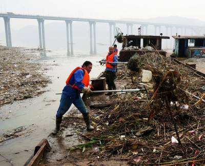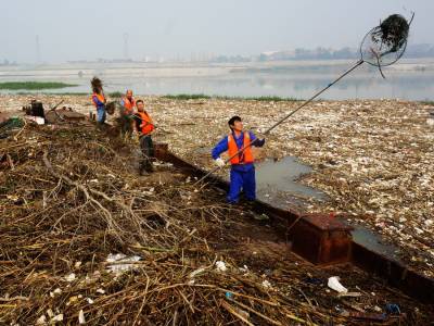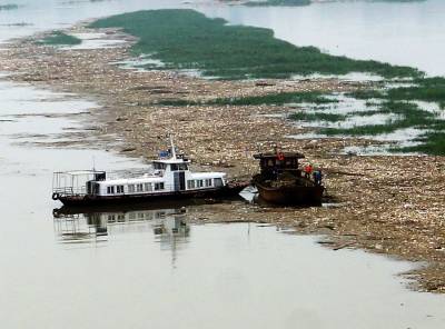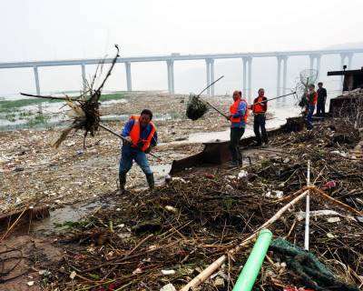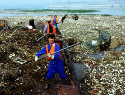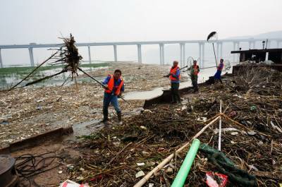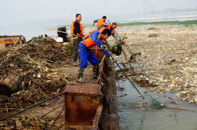9月26日,湖北省郧县海事局工作人员正在汉江江面驾船人工打捞漂浮物装船,并将拉圾运往拉圾填埋场,由于前期连续13天的降雨使干旱一年多的汉江水位猛长,达到向北方调水水位,但上游漂向郧县境内136公里江段漂来大量漂浮物,郧县海事局组织所有工作人员参加打涝漂浮物行动,以确保库区清水北送。 视界网周家山摄