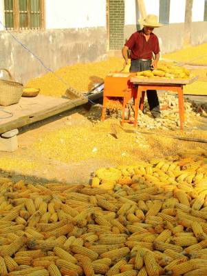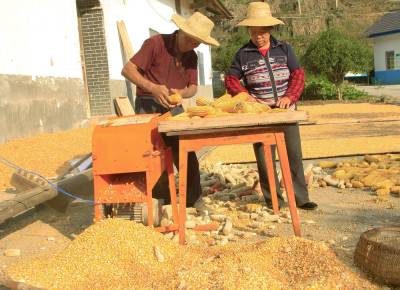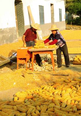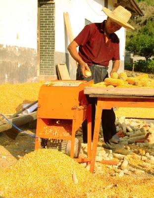 过去给玉米脱粒,一般都是用人工,费力费工效率低,现在给玉米脱粒,农民普遍用上了简易的脱粒机。现在正是玉米收获的季节,过去村民将收获的玉米挽在一起,挂在房梁上晾晒的壮观美景很难看到了,近日笔者在夷陵区三斗坪镇想看到,一台台微型脱粒机在农民的家门口嘟嘟嘟嘟地转着。听暮阳溪的村民讲,过去种十多亩玉米,收获后的脱粒工作,一家人要干几个星期。现在花上几百元,买个微型脱粒机,几家共用,一两天就把玉米脱粒这项费时费工的农活,轻轻松松地搞定了。