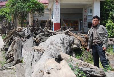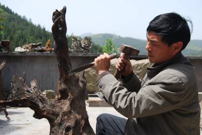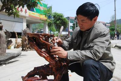 4月27日,宣恩县的中年汉子黄志鹏对千年古木制成的时尚观赏品”东方神木”作后期制作(图1、2)。据了解,从2002年开始,黄志鹏将在原县水泥厂菊花石工艺车间打工时学得的菊花石加工工艺运用到千年古木加工。黄志鹏将从县内外搜集到已有千年左右历史的古树蔸树根的阴沉木(图3)作原材料,根据阴沉木的自然形状,经过脱水—除杂(图4)—构思(立意)—设计—雕刻—抛光等环节,将千年古木加工、雕刻成”人物”、”动物”、”山水”、”花草”等被人誉为”东方神木”的时尚观赏品,产品具有多形态、硬度大、不起虫等特色、具有观赏和收藏价值,远销武汉、重庆、广东、北京等地。黄志鹏用千年古木制成的”傲骨遗韵”,2009年10月在武陵首届根艺石艺作品精品评审活动中,荣获”武陵民族根艺、石艺精品奖金奖”。(签约摄影师汪盛华)
