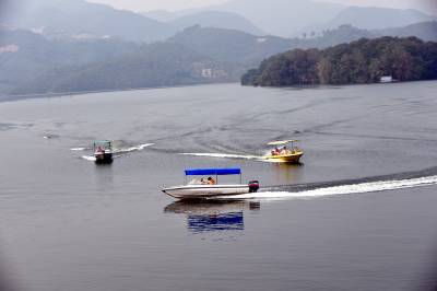 这是2014年9月25日在南漳水镜湖拍摄的游船画面。湖北省南漳县水镜湖因前期的干枯的状态已经改变。随着半月的降雨使水库的水位已经达到最佳状态。正值“十一”黄金周的到来,该县碧波旅游公司将所有的水上交通工具全面检修就绪,以良好的状态迎接各地游客的到来。