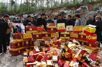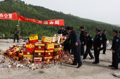 京山举行公开销毁假酒活动28日上午,京山县商务局酒管办执法人员正在销毁查获的假酒。为严打假冒伪劣酒类,维护国家、酒类产销企业和消费者合法权益,保障酒类食品与消费安全,该局组织开展了这次假酒公开销毁活动。此次销毁的假酒涉及贵州茅台、五粮液、剑南春、水井坊等14个品牌高中低档白酒估值达4.5万余元。通讯员李凯彭成祥摄通联:荆门晚报京山记者站电话:13581327777邮编:431800