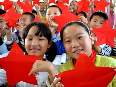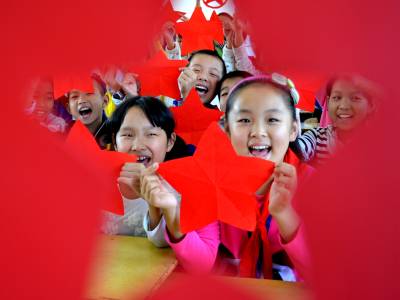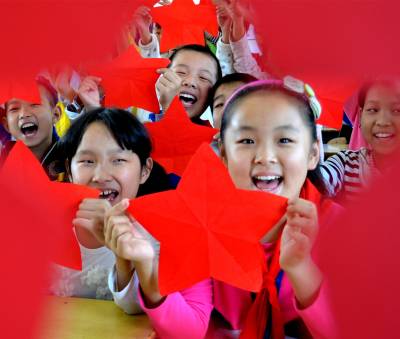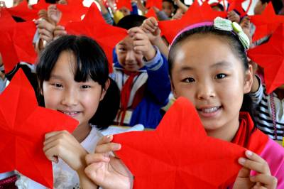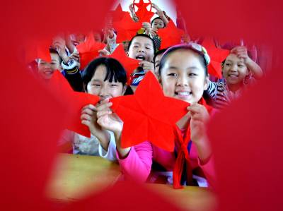 9月29日,湖北省郧县柳陂镇中心小学学生正在剪制红色“五角星”,以特殊方式庆祝祖国“母亲”65岁生日。