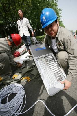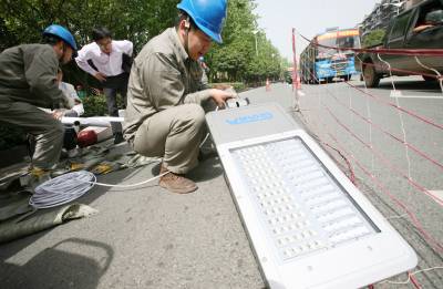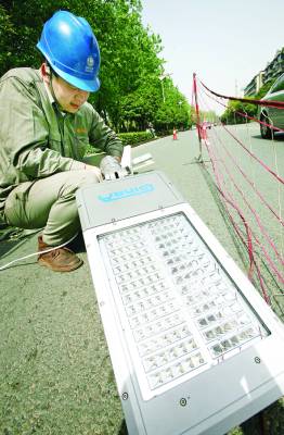 宜昌安装首批低碳路灯4月27日上午,宜昌市路灯管理中心的工作人员在沿江大道一马路口安装LED路灯。据了解,这批LED路灯是全国刚推广试用的节能低碳路灯,沿江大道上安装的36盏LED路灯为首批试验用灯,每盏灯在亮度不变的情况下要节约电能一半。宜昌市路灯管理中心彭安波摄