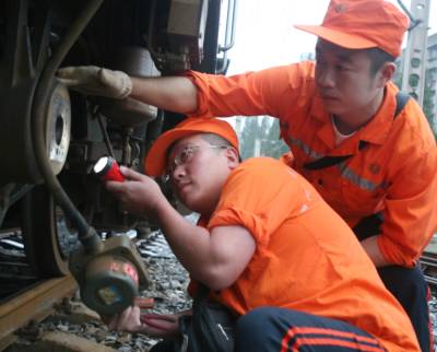 10月1日,襄阳电务段机车信号工赵襄阳、武阳在检查和谐号0977机车速度传感器。 次次标准,台台达标。“十一”黄金周期间,襄阳电务段机车信号工坚守岗位,认真按标检测(修)机车,确保机车安全万无一失。