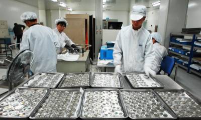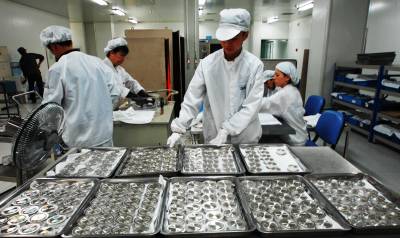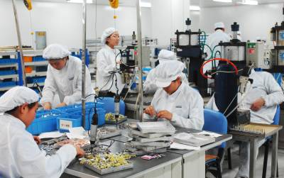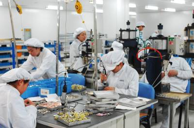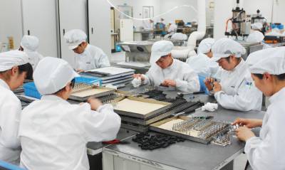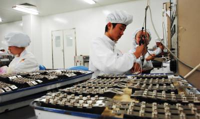 4月28日,湖北台基半导体股份有限公司员工在现代化的生产线上加工生产。,湖北台基半导体股份有限公司在深圳证券交易所创业板挂牌上市后,员工们欢欣鼓舞,加紧生产,今年一季度实现营业收入4442万元,同比增长22.52%,净利润980万元,同比增长88.52%。2010年,公司将抓住国家加快发展电子元器件和公司上市的契机,力争实现销售回款超3亿元,利润突破6000万元。