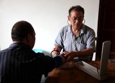 柴贵兵不辞辛苦为村民治病42年 谷城县紫金镇垭子口村62岁的村医柴贵兵,从20岁开始就一直在村里行医,42年来为村民们辛辛苦苦治病,常规检查和困难群众还免收费用,对行动不便的村民上门诊治送药,受到一辈一辈的村民们的爱戴。图为柴贵兵上门为低保户尿毒症患者汪家山体检。 谷城县城粉阳路33号(县宣传部)帅瑜 摄 (手机13972211958邮编441700)